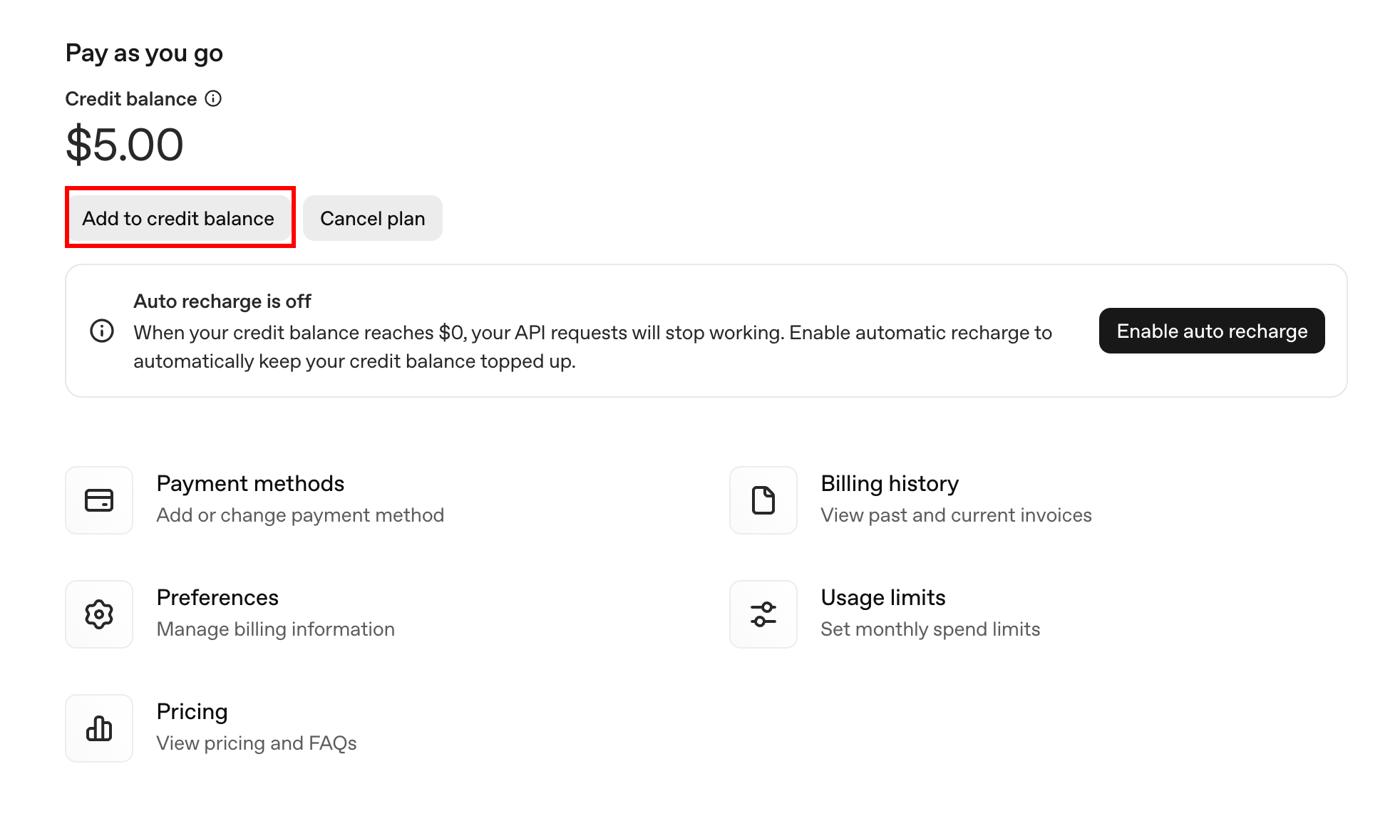 And set up your billing system. The initial credit purchase is at least $5. You can choose if you want automatic recharge. If you're just testing out the platform, $5 is more than enough.