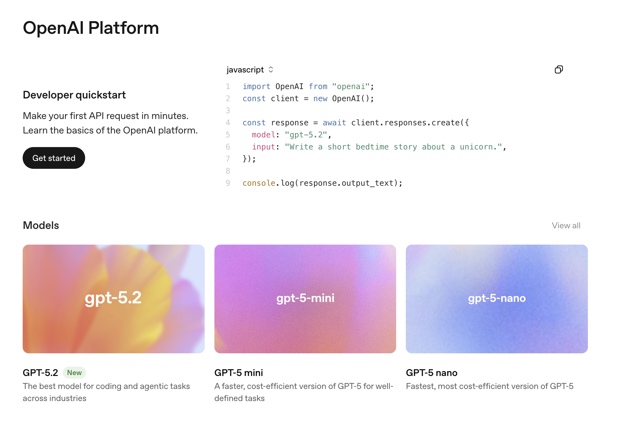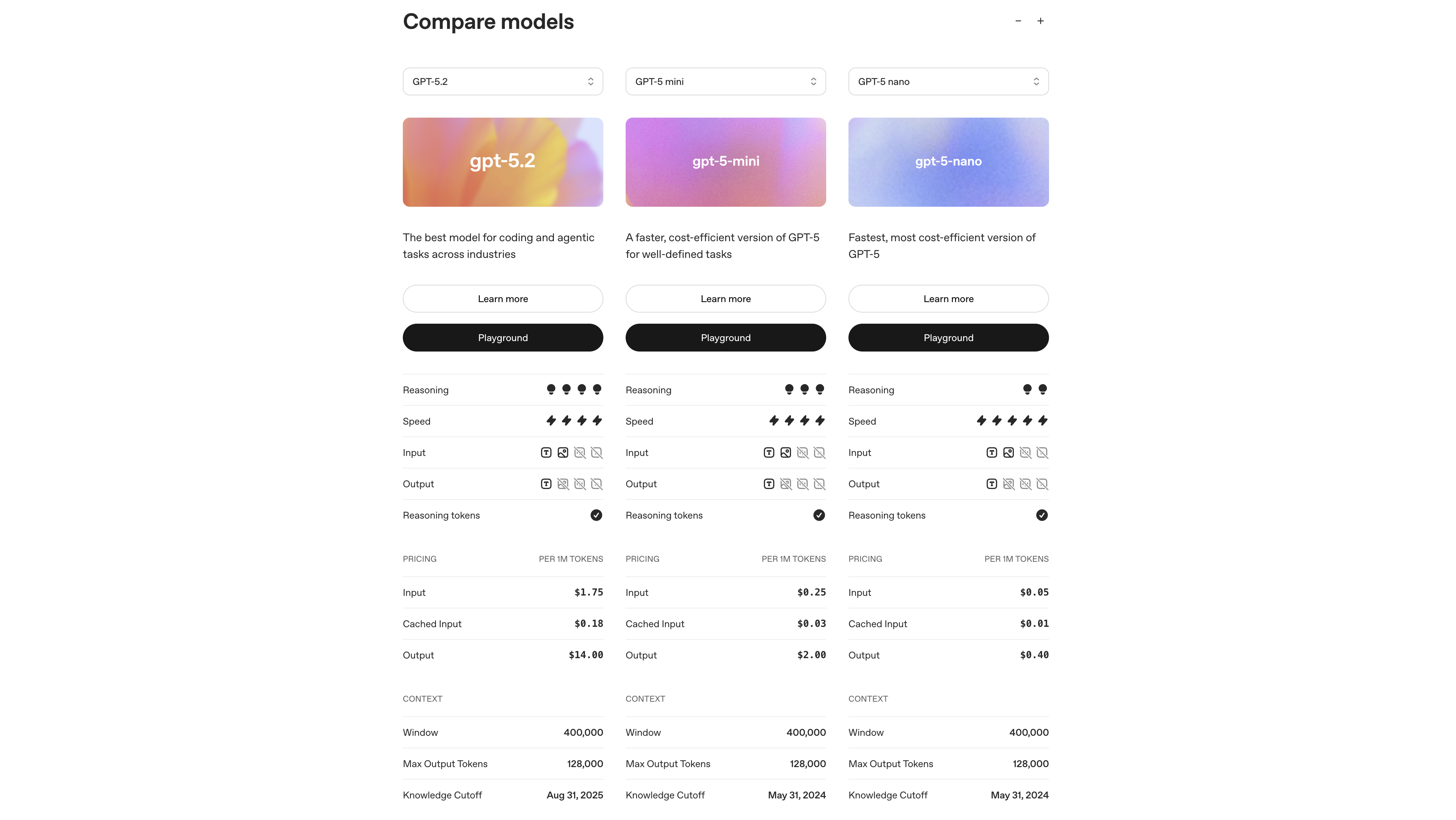 GPT-5 nano is the fastest among the three, and it is ideal for quick summarization and classification tasks, or any high-volume jobs that does not require reasoning. It is also much cheaper than GPT-5.2, at only $0.05 per million tokens for input, and $0.40 per million tokens for output.