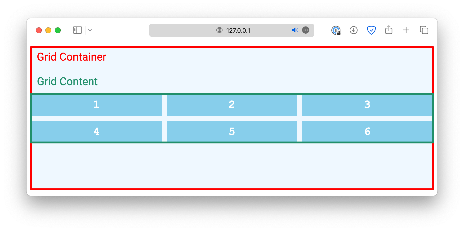 <!DOCTYPE html> <html lang="en"> <head> <meta charset="UTF-8"> <meta name="viewport" content="width=device-width, initial-scale=1.0"> <title>Document</title> <link rel="stylesheet" href="/styles.css"> </head> <body> <div class="container"> <div class="item">1</div> <div class="item">2</div> <div class="item">3</div> <div class="item">4</div> <div class="item">5</div> <div class="item">6</div> </div> </body> </html>