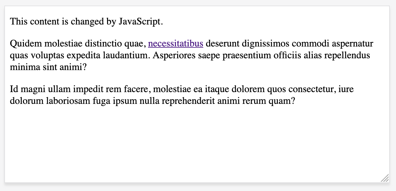 "This content is changed by JavaScript. <a href=''>This link is changed by JavaScript as well.</a>";However, this method of creating HTML nodes is generally not recommended, because it is likely that your code editor will not provide syntax highlighting, and it might lead to mistakes.