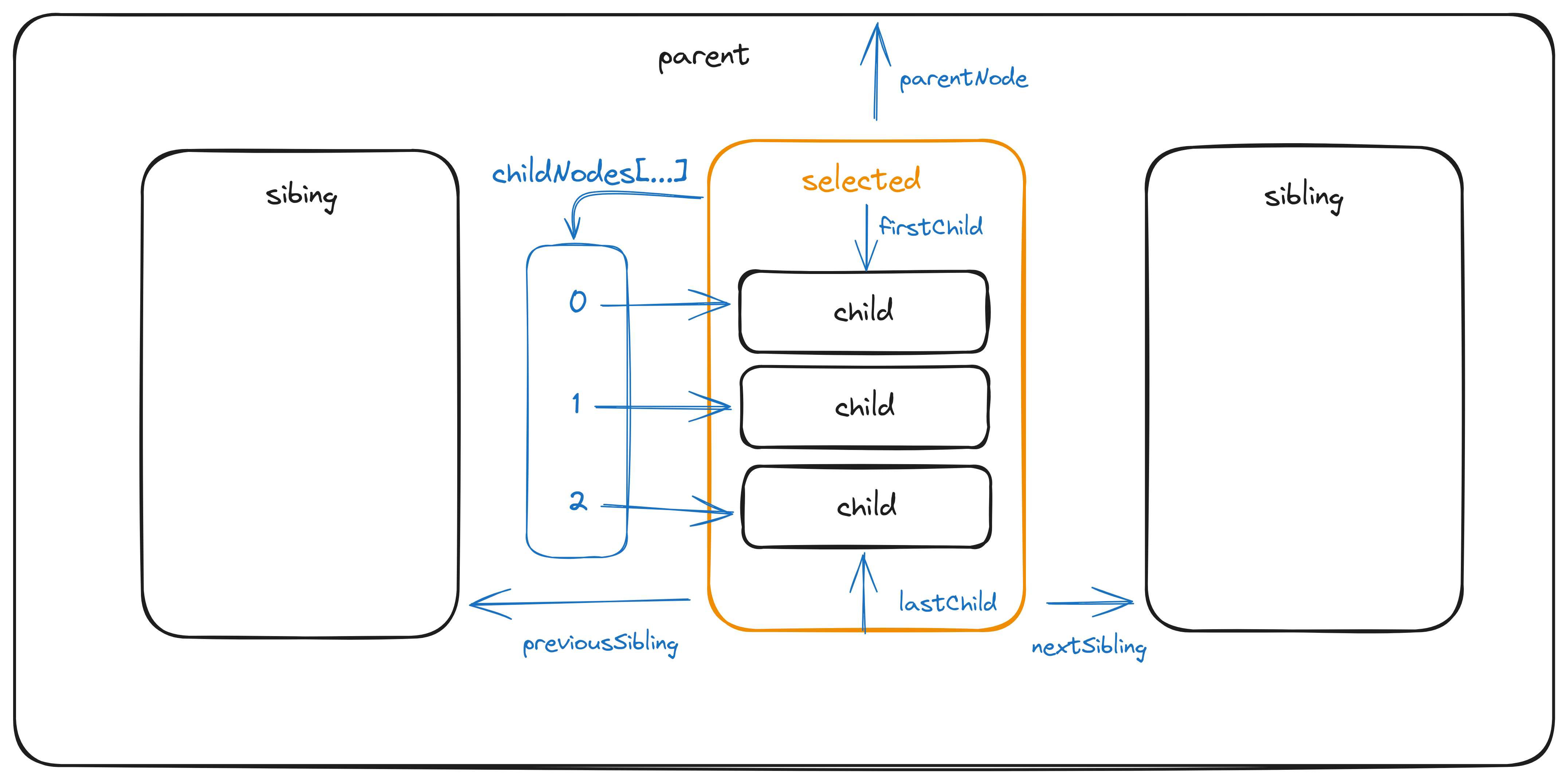 console.log(parent.lastElementChild);The sibling nodes can be accessed through properties nextSibling and previousSibling.